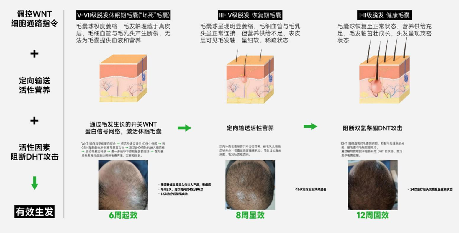 ·临床数据支持:对中重度空置毛囊,信号通路生发的激活率达 98%(2025 年《Stem Cell Research & Therapy》),6 个月毛发密度平均提升 85%,效果不亚于植发;