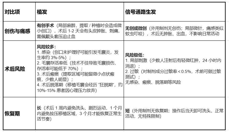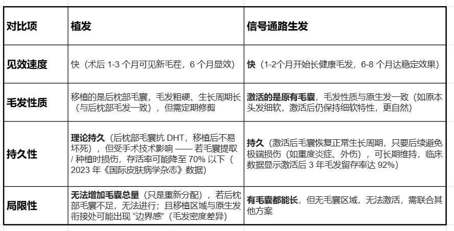 植发和信号通路生发的核心差异,在于 “是否能修复自身毛囊”—— 对中重度秃发而言,若自身毛囊未坏死,信号通路生发是 “更安全、更自然、性价比更高” 的选择,毕竟 “唤醒自己的毛囊,比移植别人的毛囊更贴合需求”;若毛囊已完全坏死,植发或者假发则是更直接的外观改善方案。