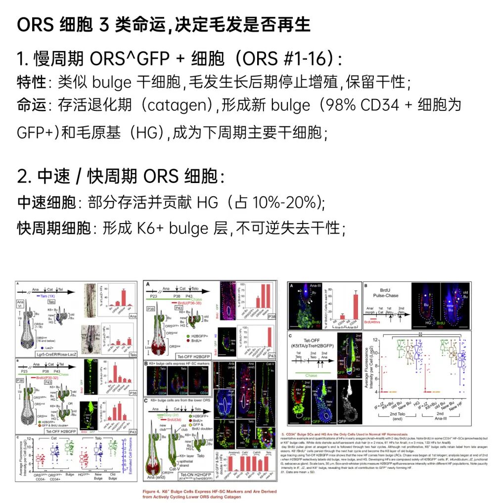 ·中速周期 ORS 细胞(ORS #17-40):位于 ORS 中段,在 ORS^GFP + 细胞停止增殖后仍维持短暂增殖,部分存活 catagen 期并贡献 HG 细胞的 10%-20%,但干性显著弱于 ORS^GFP + 细胞(分裂次数多 1-2 次)。