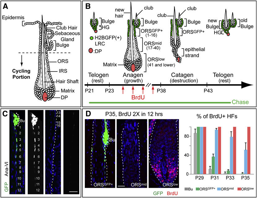 该研究通过 Tet-Off H2BGFP 小鼠(K5 启动子调控,GFP 强度反映细胞分裂次数)与 BrdU 脉冲追踪,将 anagen 期 ORS 细胞按增殖特性分为三类,且其命运存在显著差异: