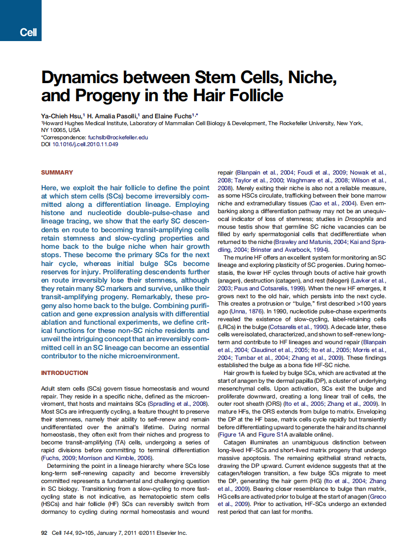 参考文献 Ya-Chieh Hsu, H. Amalia Pasolli, Elaine Fuchs. Dynamics between Stem Cells, Niche, and Progeny in the Hair Follicle[J]. Cell, 2011, 144(1): 92-105. DOI: 10.1016/j.cell.2010.11.049