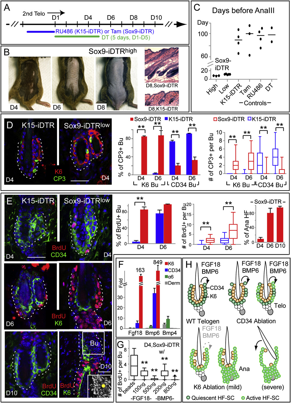 ·信号调控:实时 PCR 检测显示,K6 + 细胞中 FGF18、BMP6(维持 HF-SC 静息的关键信号分子)的表达量是 CD34+ bulge 细胞的25 倍以上;外源性注射 FGF18/BMP6 可完全抑制 K6 + 细胞消融后 HF-SC 的过度激活,证实其通过分泌信号维持 telogen 期 HF-SC 的静息状态。