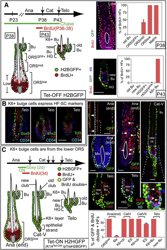 来源明确:通过 Lgr5-CreER 谱系追踪与 K14-Tet-On/H2BGFP 标记证实,K6 + 层来源于 lower ORS(而非基质或伴随层),是快周期 ORS 细胞在 catagen 期 “命运转向” 的产物。