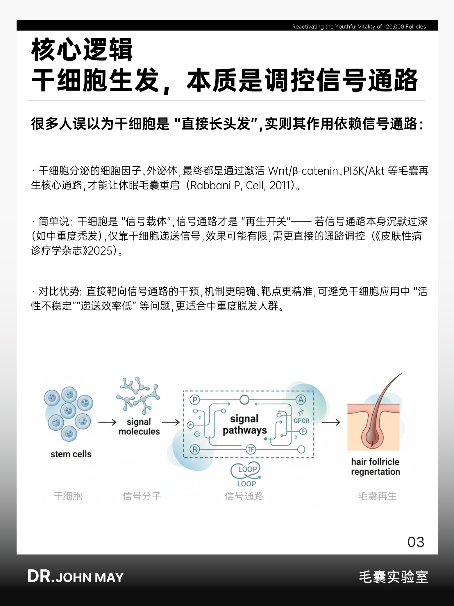 而对于中重度秃发患者,由于长期脱发已导致 Wnt/β-catenin 通路深度沉默,仅靠干细胞间接递送信号,难以打破通路休眠状态,需更直接的信号通路调控方案。《中华皮肤科杂志》2025 年《中国雄激素性脱发诊疗指南》也强调,中重度秃发的干预核心应聚焦 “直接激活毛囊核心信号通路”,而非依赖信号载体的间接作用。