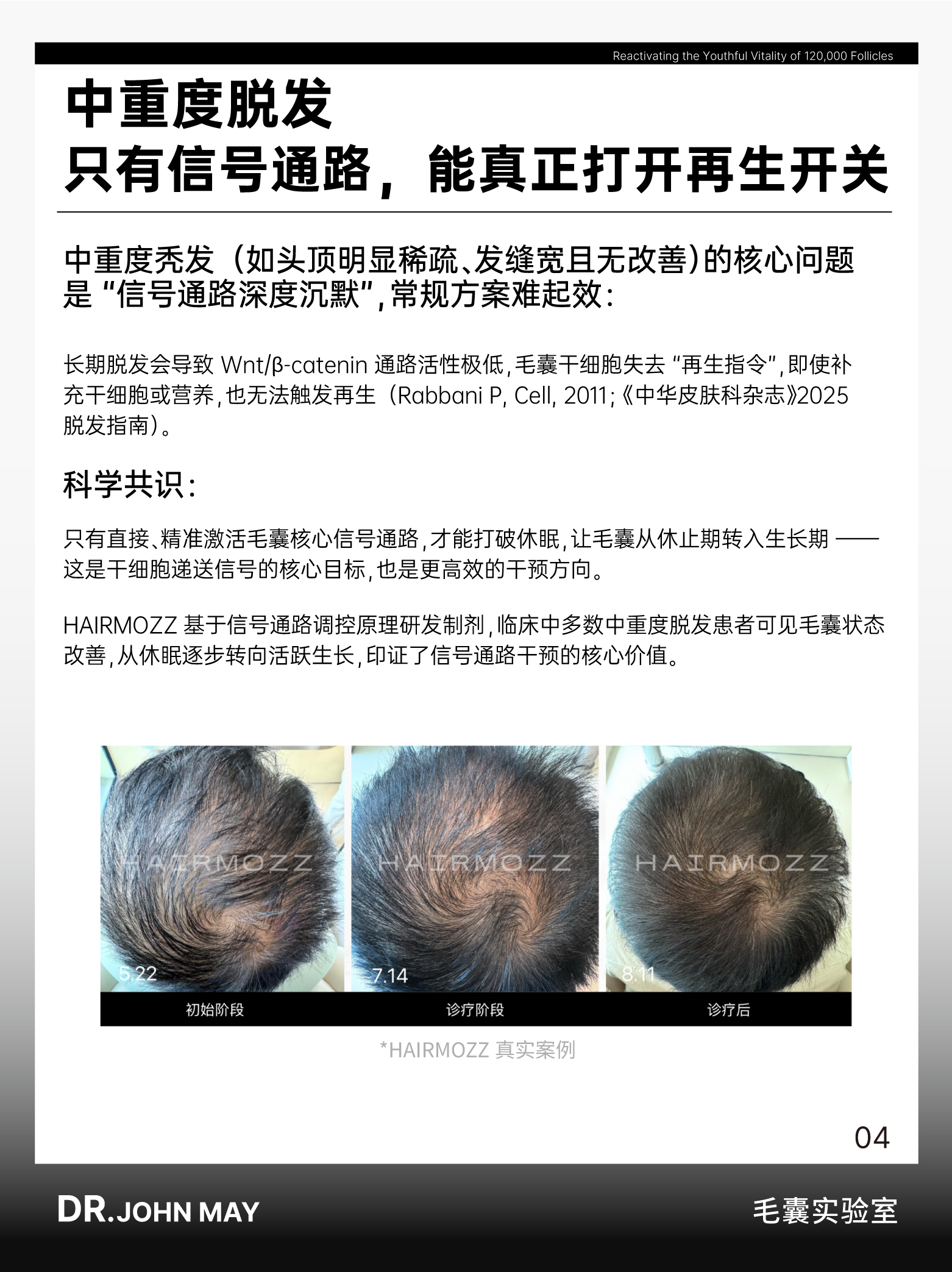 HAIRMOZZ 茂丝的这一探索,也为脱发干预领域提供了重要启示:在干细胞等前沿技术尚处转化阶段的当下,基于成熟科研机制、聚焦核心靶点的精准干预,或许是更贴合当前临床需求的选择。