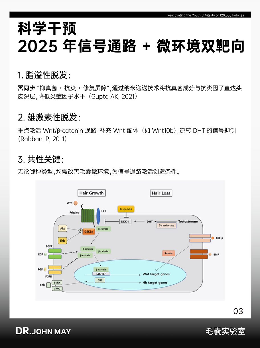 无论是 “DHT 介导的 AGA” 还是 “炎症主导的非 AGA 脂溢性脱发”,其最终导致毛囊失能的核心环节存在共性 ——“Wnt 信号通路沉默” 与 “头皮微环境紊乱” 的双重打击。